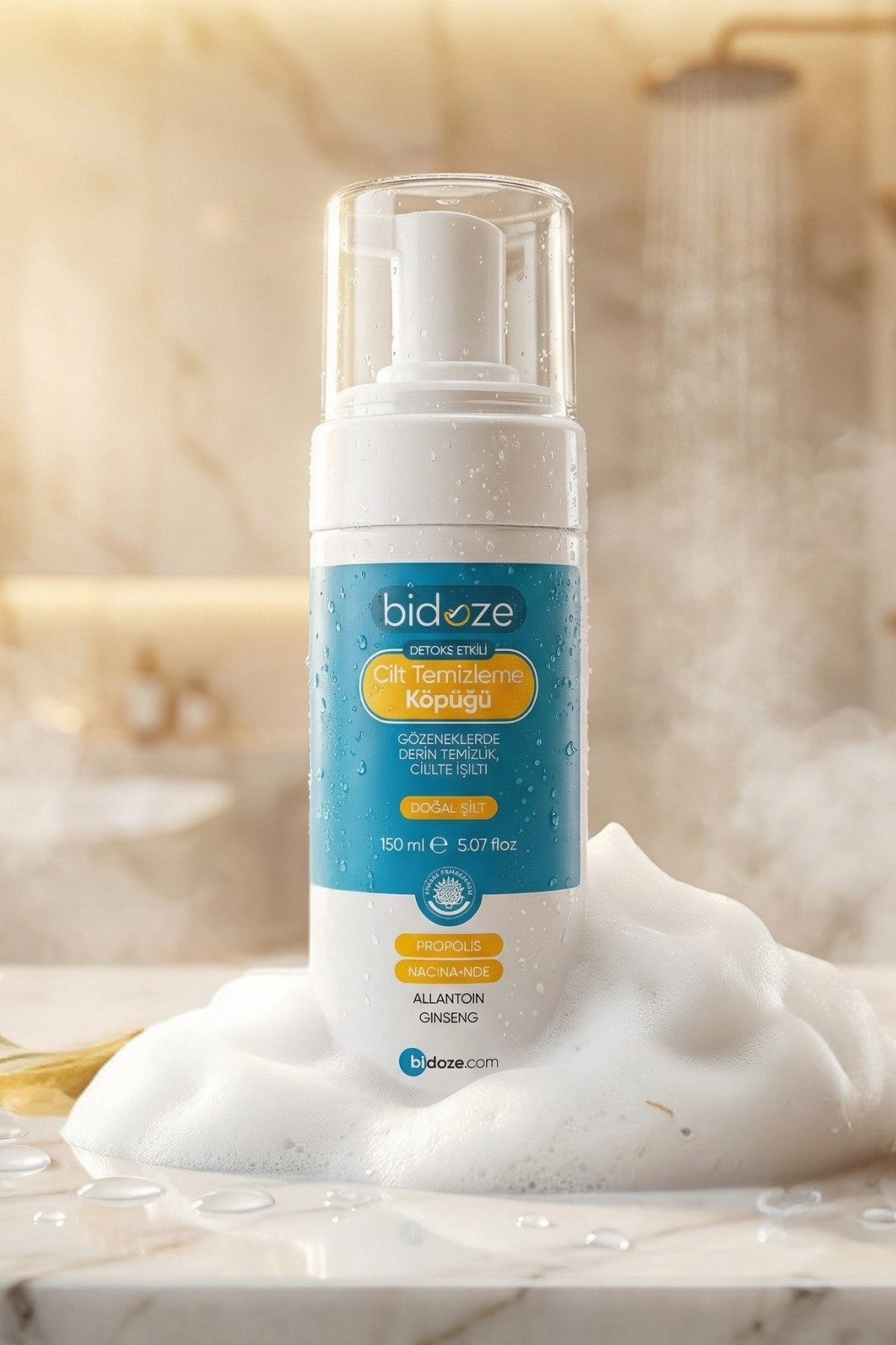 Bidoze Cilt Temizleme Köpüğü, cildinizi günün yorgunluğundan, makyaj kalıntılarından, yağdan ve kirden arındırırken; içeriğindeki Propolis ve Ginseng ile cildinize doğal bir arınma hissi sunan lüks bir temizleyicidir.